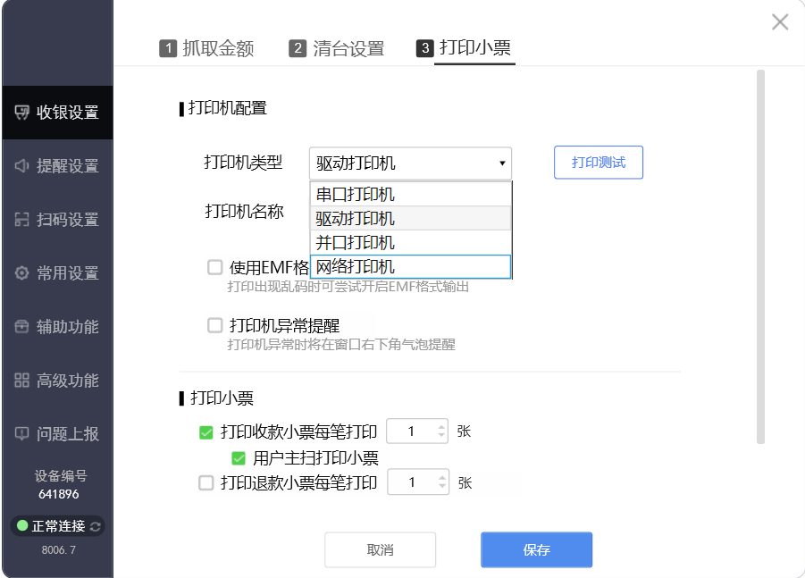 例如,收银机连接的串口打印机,使用串口COM2,那需要在“打印机类型”中选择“串口打印机”,并设置“打印机端口”为COM2,保存后客户端就可以打印小票。