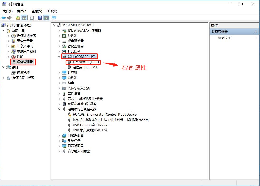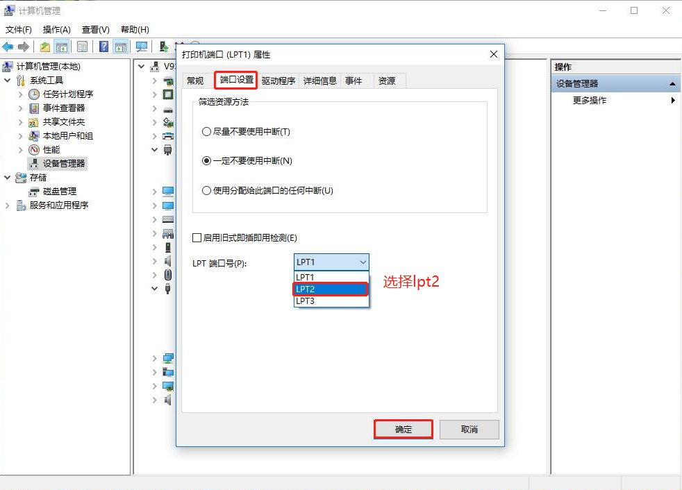 将电脑原本的【lpt1】改为【lpt2】(右键我的电脑→管理→设备管理→端口→通讯端口,右键属性→端口设置→点击端口号选择)