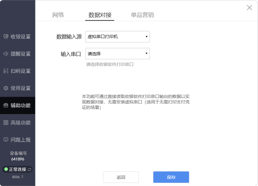 点击数据对接---选择"虚拟串口打印机"→输入串口选择虚拟的【com2】(另一个端口),点击保存。